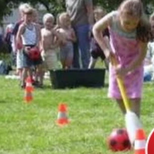 Met behulp van een knotshockey knots moet de bal slalom om de pionnen geloodst worden. geeft de bal en de stick snel door aan je teamgenoot en die maakt neemt dezelfde route weer naar de start om daar zijn stick en bal weer door te geven aan de volgende en zo door totdat alle teamleden zijn geweest.
