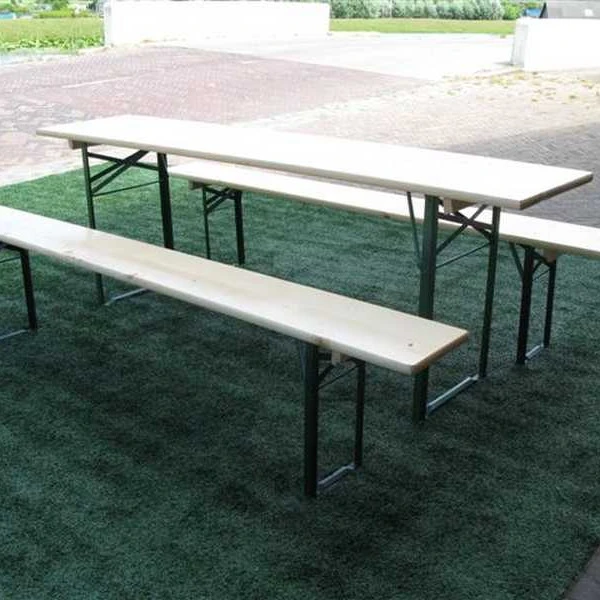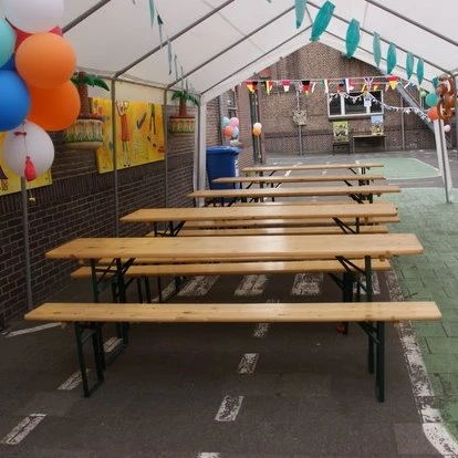 Biertafel met 2 banken, ideaal voor grote groepen. Niet alleen om aan te zitten om te eten of gezellig te kletsen maar ook zeer geschikt om kinderen te laten kleuren of kliederen. Makkelijk schoon te maken en neemt opgeklapt weinig ruimte in beslag.