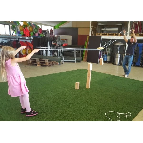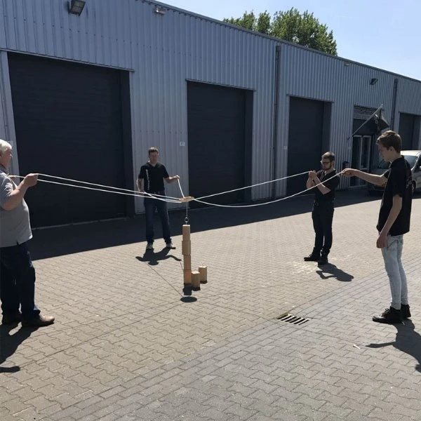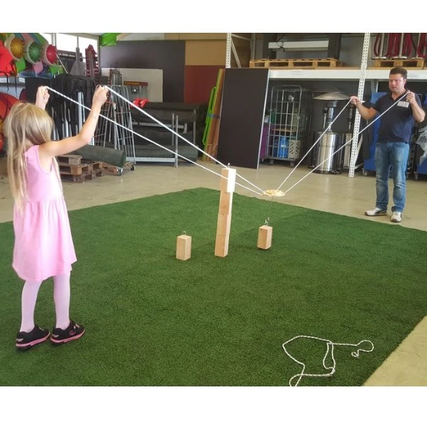 Werk samen met je teamgenoten om de blokken op elkaar te stapelen. Dat lijkt makkelijk maar dit doe je door middel van touwen met in het midden een haak waarmee je het blok moet zien op te tillen en te verplaatsen.