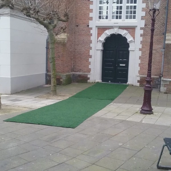 Groene loper van kunstgras. Geen beurstapijt maar echt mooi professioneel kunstgras. Leuk voor evenement, bruiloft of feest met een boerenthema.