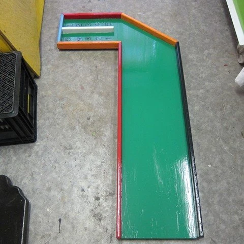 Dit is niet gewoon sjoelen, maar sjoelen met een hindernis. Op deze baan is het namelijk de bedoeling dat je om het hoekje sjoelt. De schijven komen aan het eind van het eerste stuk tegen de schuine kant aan en kaatsen af richting de poortjes!