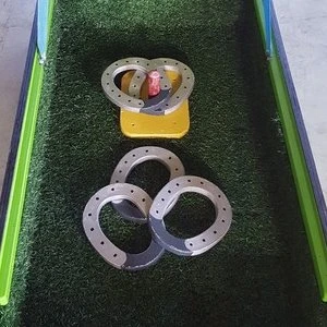 Probeer zoveel mogelijk hoefijzers om de paal te gooien. Zee leuk Oudhollands spel voor jong en oud.