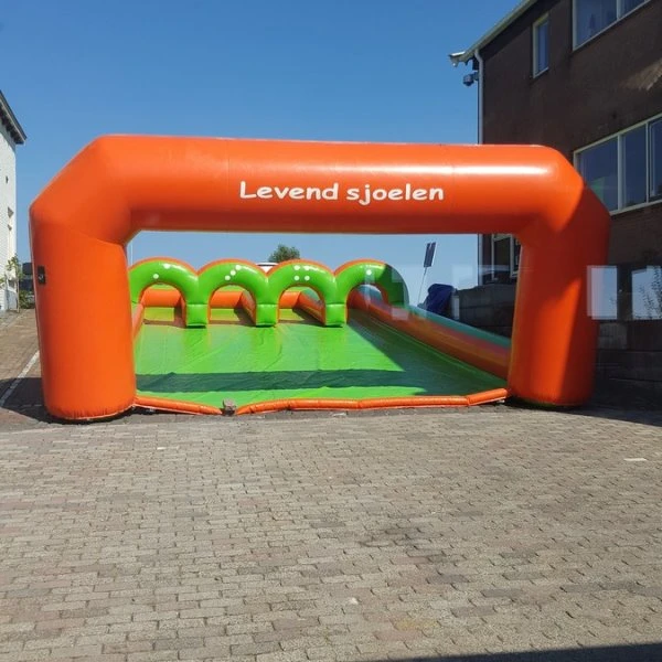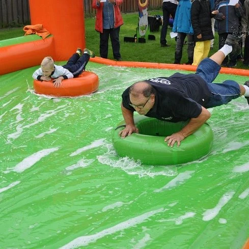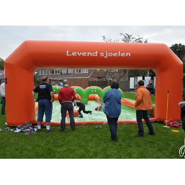Sjoel jezelf op een opblaasbare sjoelsteen door het poortje! Glijd op een tobbedansbootje over de baan en probeer het poortje met de meeste punten in te sturen. Een super attractie voor een waar waterspektakel.
