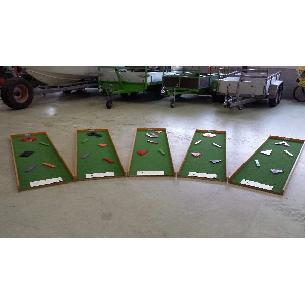 Deze midgetgolfbaan, ook wel minigolf genoemd, is voorzien van verschillende obstakels. Het leuke aan deze set is dat elke straat of tuin binnen no-time is omgetoverd in een echte midgetgolfbaan. Deze mobiele midgetgolfbanen zijn zeer geschikt voor uw event, straatfeest of kinderpartijtje.