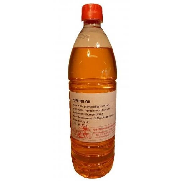 Mix van diverse hoogwaardige oliën met boter aroma. De olie is 100% plantaardig en bevat minder dan 30% verzadigde vetten. Door de hoge verbrandingstemperatuur is Poffing Oil zeer geschikt voor het produceren van poffertjes.