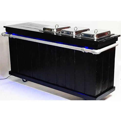 Deze stijlvolle steigerhouten buffetbar is een mooie aanvulling voor uw feest of diner. De buffettafel is voorzien van 3 verzonken bakken met deksel om uw heerlijke gerechten in te serveren. De bar is voorzien van een ledstrip die in iedere gewenste kleur kan worden ingesteld.
