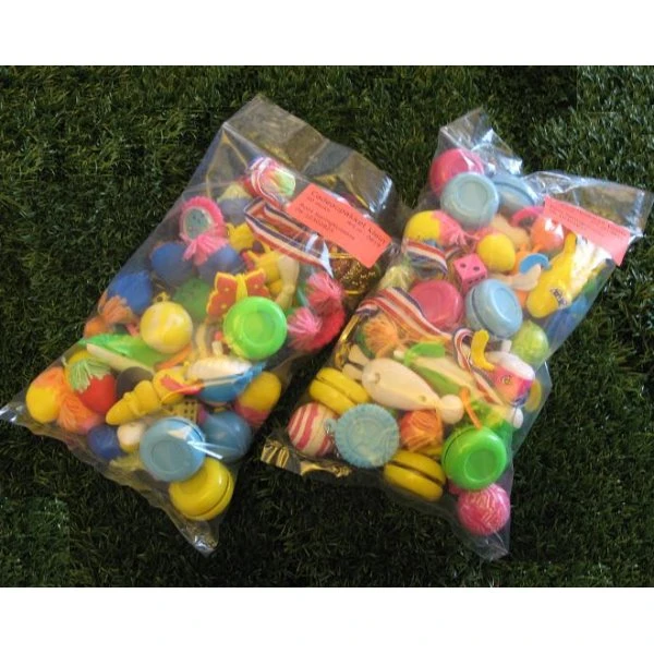 De cadeaupakket klein bestaan uit bijvoorbeeld: Stuiterballetjes, jojo’s, gummetjes e.d.