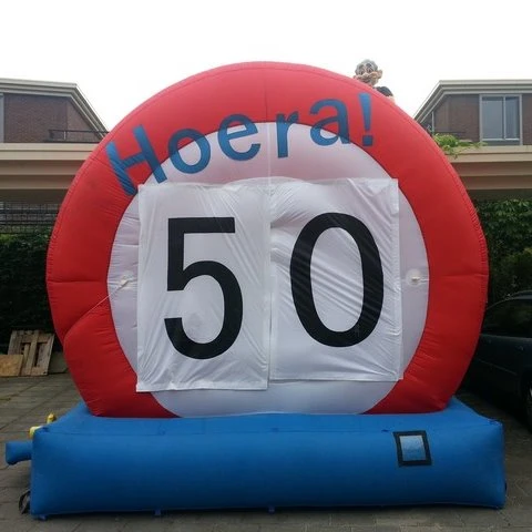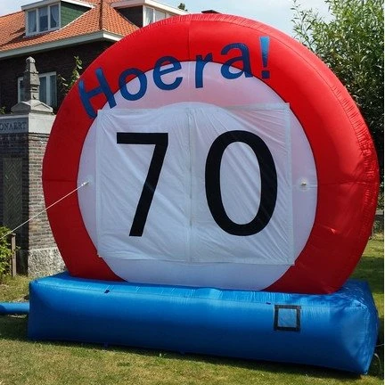 Bezorg het feestvarken een verjaardag om nooit te vergeten met dit 3 meter hoge opblaasbare verkeersbord. Zeer leuk om voor de deur, in de tuin of op de feestlocatie neer te zetten om aan te kondigen dat het groot feest is. Het verkeersbord ook bij jubilea is dit een absolute blikvanger.