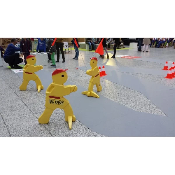 Victor veilig is een groen poppetje voorzien van grote “slow!” sticker om bestuurders te alarmeren dat er kinderen aan het spelen zijn. Zeker bij het gebruik van een springkussen of attractie is onze Victor een zeer effectieve manier op bestuurders van passerende voertuigen er aan te herinneren vaart te minderen.