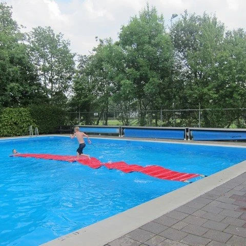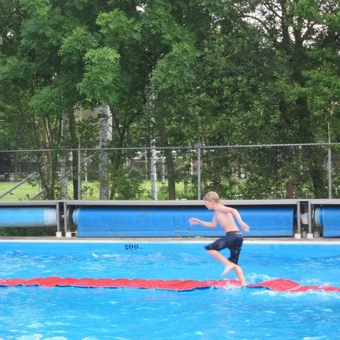 Deze speciale zwembadloper (loopbrug) blijft drijven op het water. Loop of ren zover mogelijk over de mat naar het einde zonder in het water te vallen.